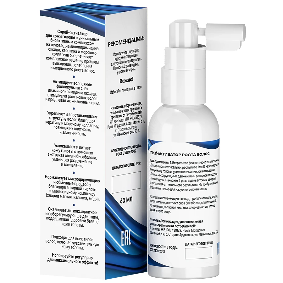 Усиленный спрей-активатор для роста волос с кератином и морским коллагеном. Теперь в два раза сильнее! Стимулирует рост волос, укрепляет и восстанавливает структуру волос. Подходит для всех типов волос, включая чувствительную кожу головы.