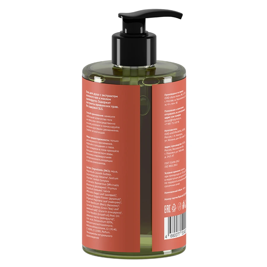 Состав: Aqua, Magnesium Laureth Sulfate, Cocamidopropyl Betaine*, Sodium Chloride*, Herbal Complex of Extracts: Rosmarinus Officinalis (Rosemary) (розмарин)*, Thymus Serpyllum (тимьян)*, Salvia Officinalis (Sage) Leaf (шалфей)*, Origanum Vulgare Flower (душица)*, Origanum Majorana Leaf (майоран)*, Ocium Basilicum (Basil) (базилик)*, Camellia Sinensis (Green Tea) Leaf (зелёный чай)*; Glycerin (глицерин)*, Citrus Paradisi (Grapefruit) Peel Oil (эфирное масло грейпфрута)*, Citric Acid, Tetrasodium EDTA, Methylchloroisothiazolinone, Methylisothiazolinone, CI 19140, CI 42090, CI 15985, Parfum. *Ингредиенты натурального происхождения
