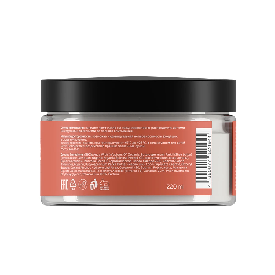 Формула обогащена органическими маслами ши, арганы, макадамии, маслом баобаба и витамином Е. Идеальный спутник для ритуала ухода, превращающий ежедневную заботу о коже в искусство наслаждения.